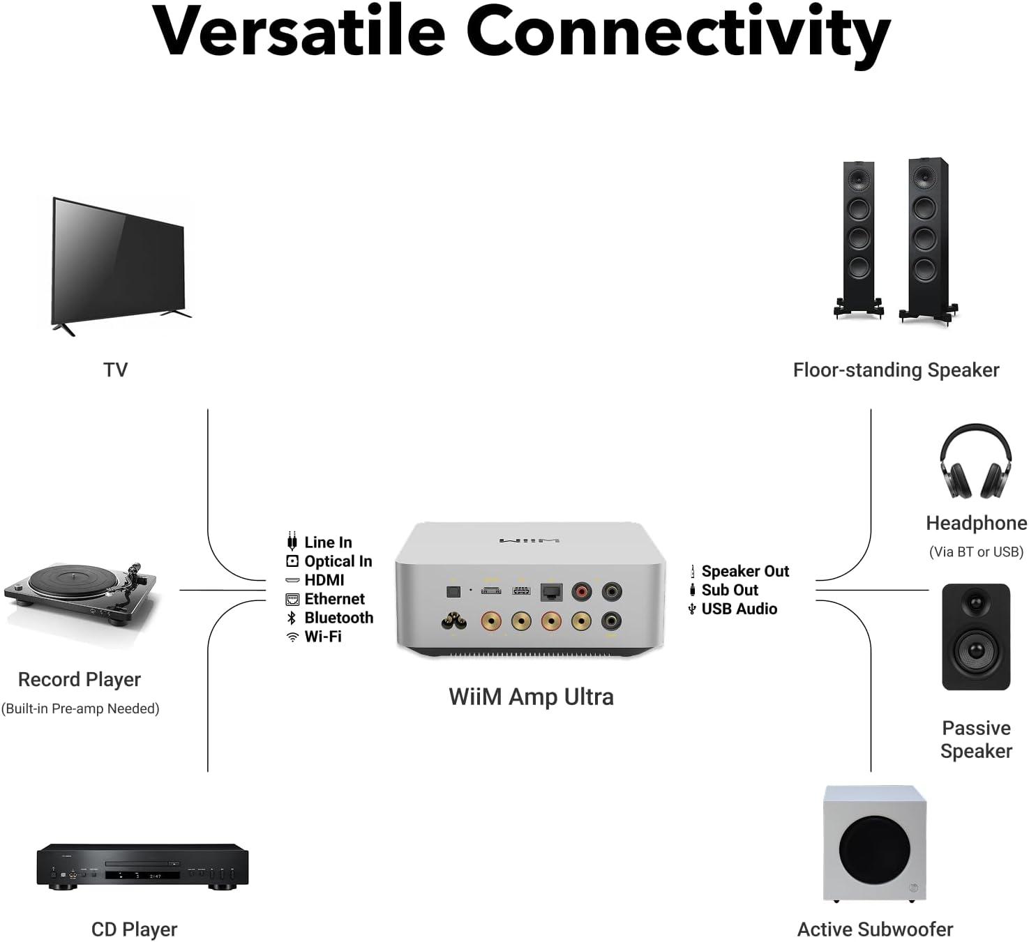 WiiM Amp Ultra with Voice Remote 2 | 100W Streaming Amplifier with Premium ESS ES9039Q2M DAC & Dual TI TPA3255 Amps | Built-in RoomFit EQ & Touchscreen | HDMI ARC, Optical, RCA Inputs | Space Gray(Silver)